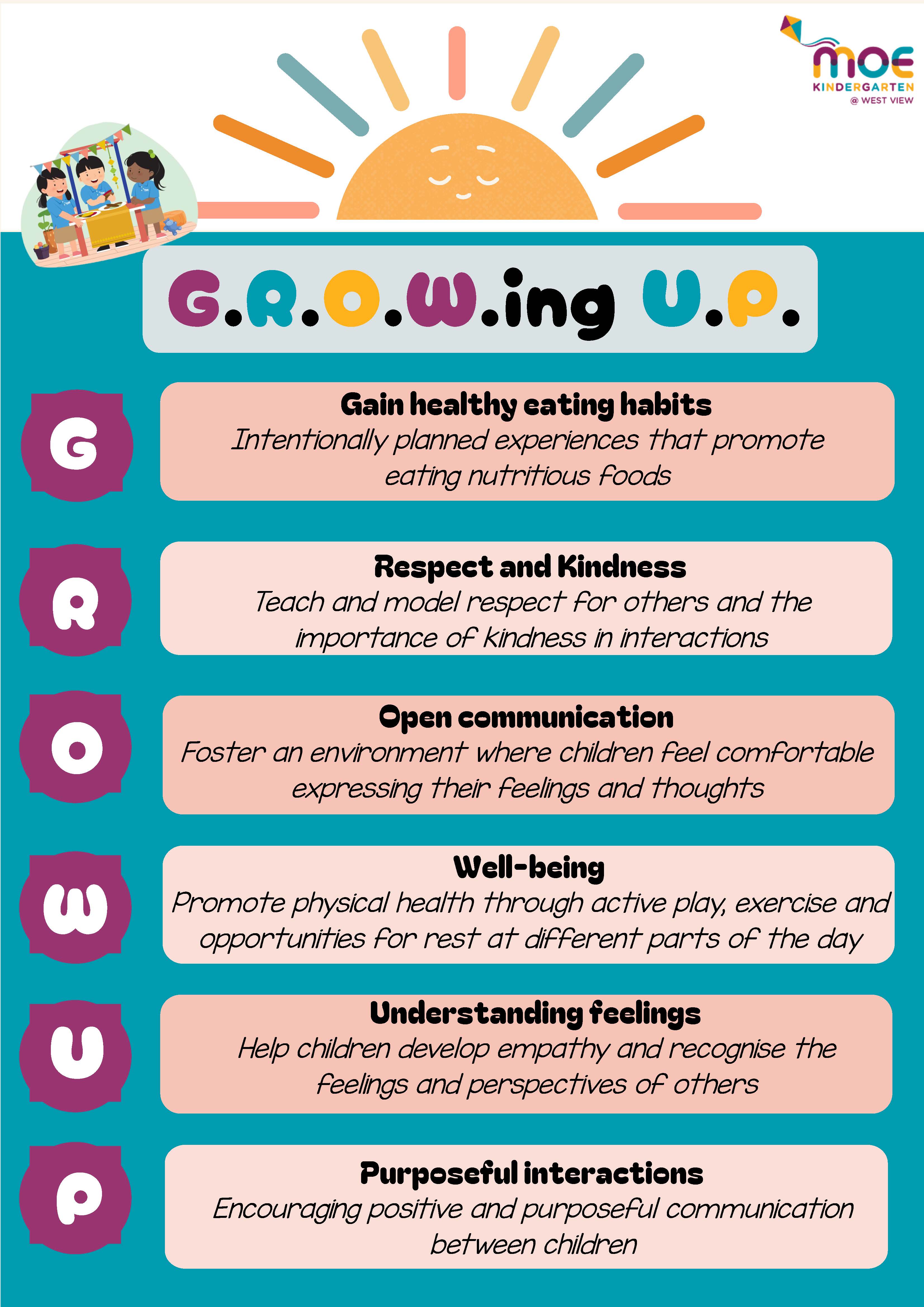 To support our vision “A Strong Start for Every Child”, G.R.O.W.ing U.P is designed to promote holistic development of our children with a focus on inculcating values and developing social and emotional competencies in them. As the early years is a critical period of children’s growth and development, it also aims to create their awareness in healthy eating and keeping physically active that will help them develop habits to embrace an active and healthy lifestyle.