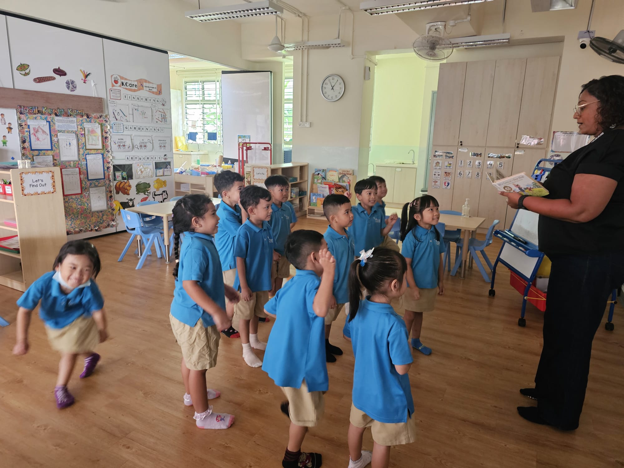 the teacher narrates and children act out the adventure. The session ends